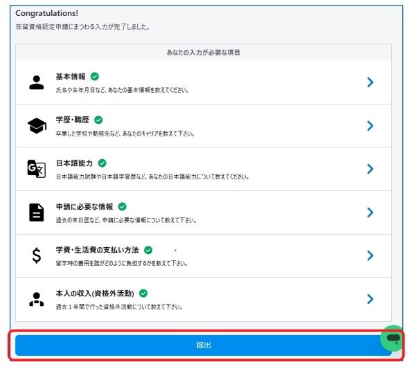 - すべての項目の入力が完了すると、各項目のチェックマークがグレーから緑色になり、「提出」ボタンが青色になります。
